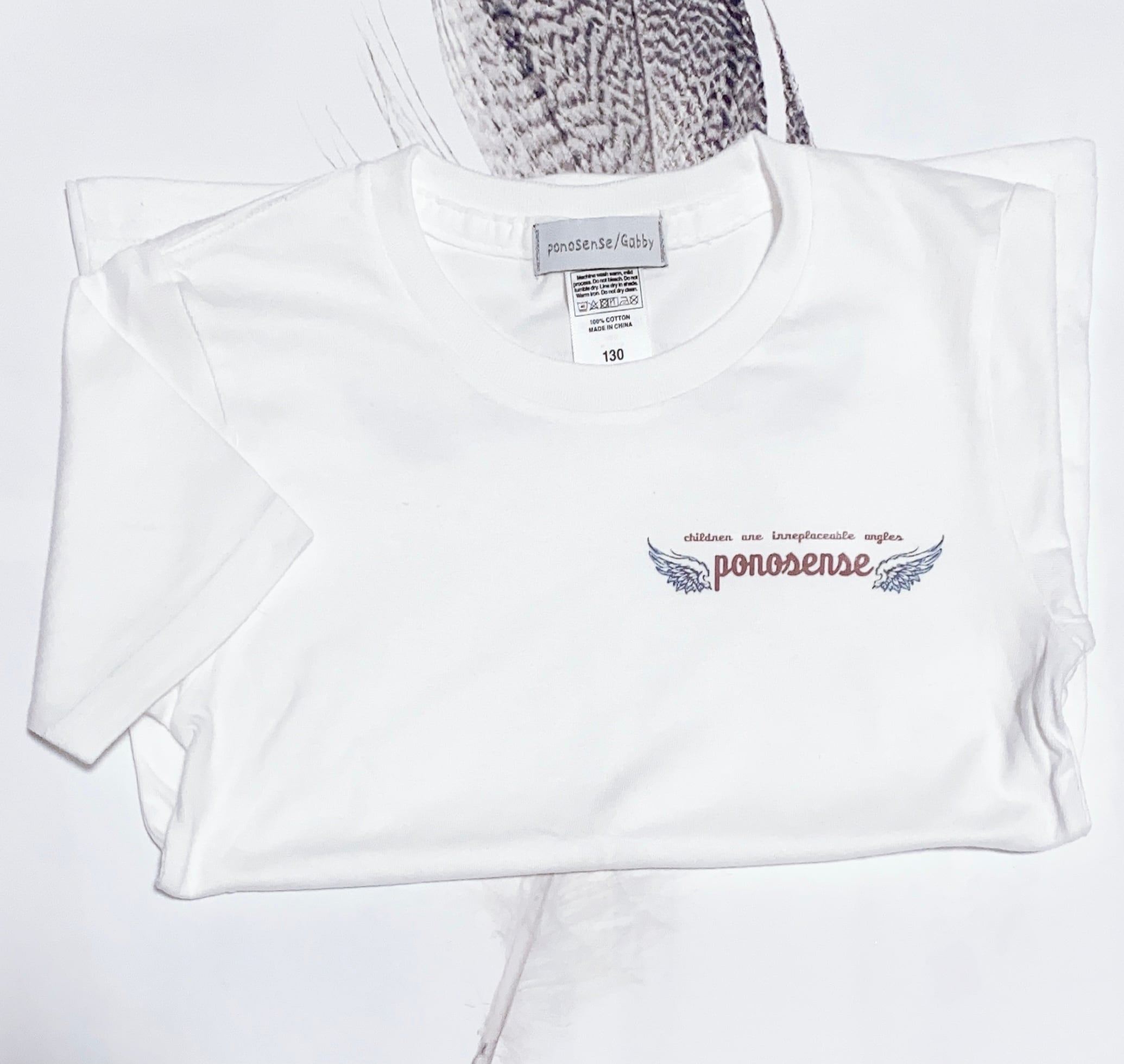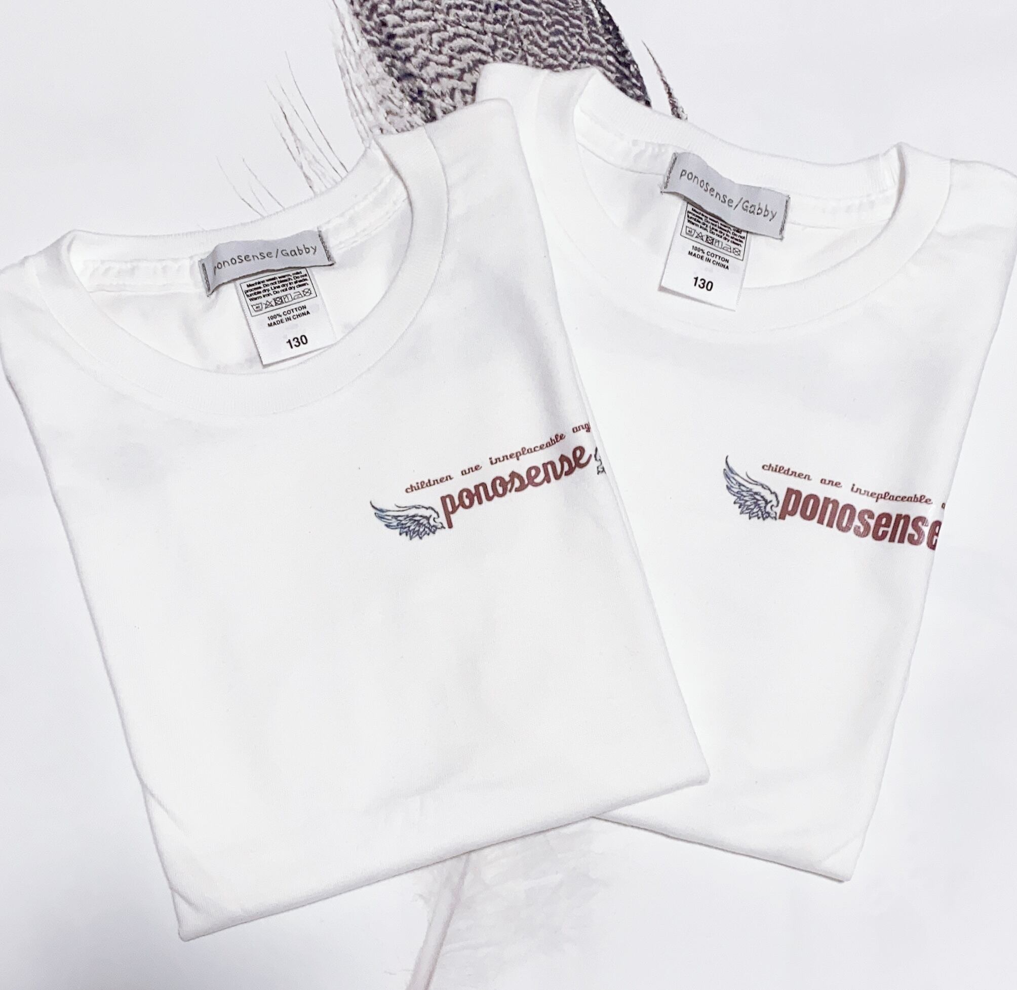 シンプルなロゴTシャツ 胸、背に転写プリントされています 書体の違うものとなります こちら向かって左側のロゴページです サイズ130