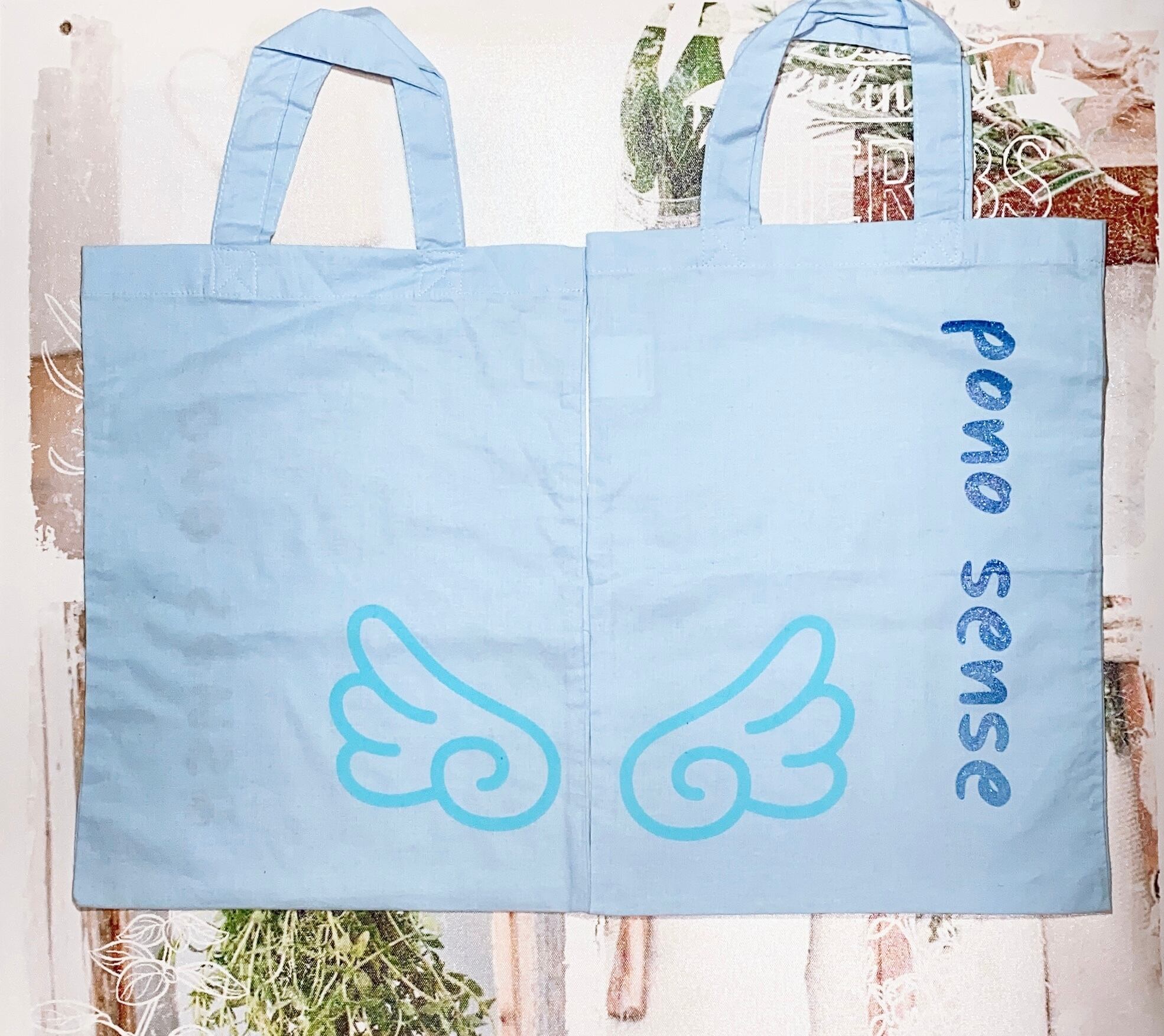 薄手トートバッグです キラキラジェルのロゴとフロッキーの羽のプリント 2枚価格です 縦33横26持ち手長さ10