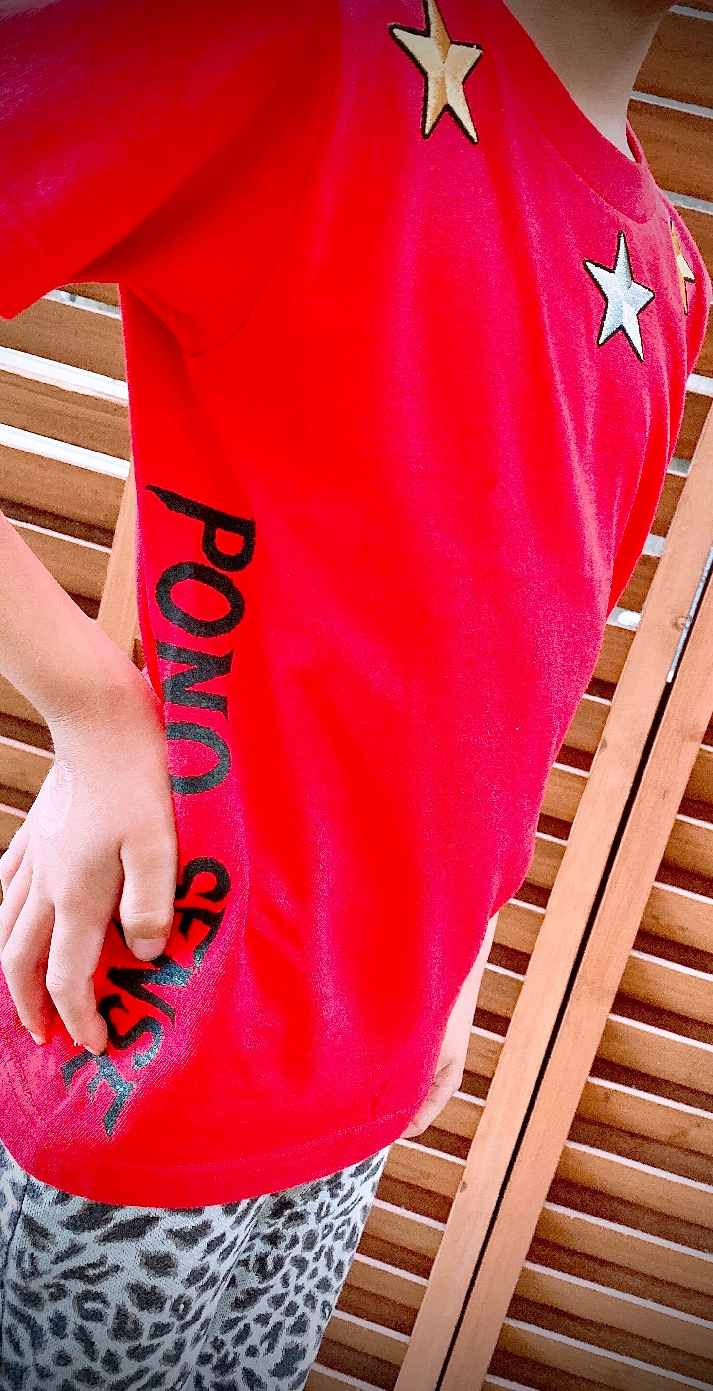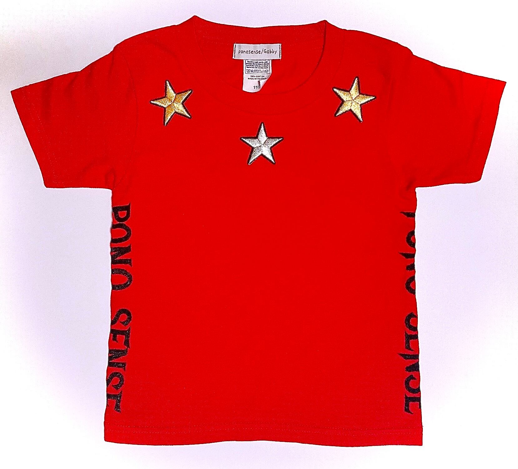 胸にはシルバーとゴールドのスターワッペンがついていて 両脇にロゴ(光沢のない黒インク使用) 背中には 光沢のあるインクを使用していて とても目立ち、かっこいいですよ! サイズは110or120 ※ラインストーン+タグ付き 大人用もあります! お揃いで是非♡かっこいいですよ!